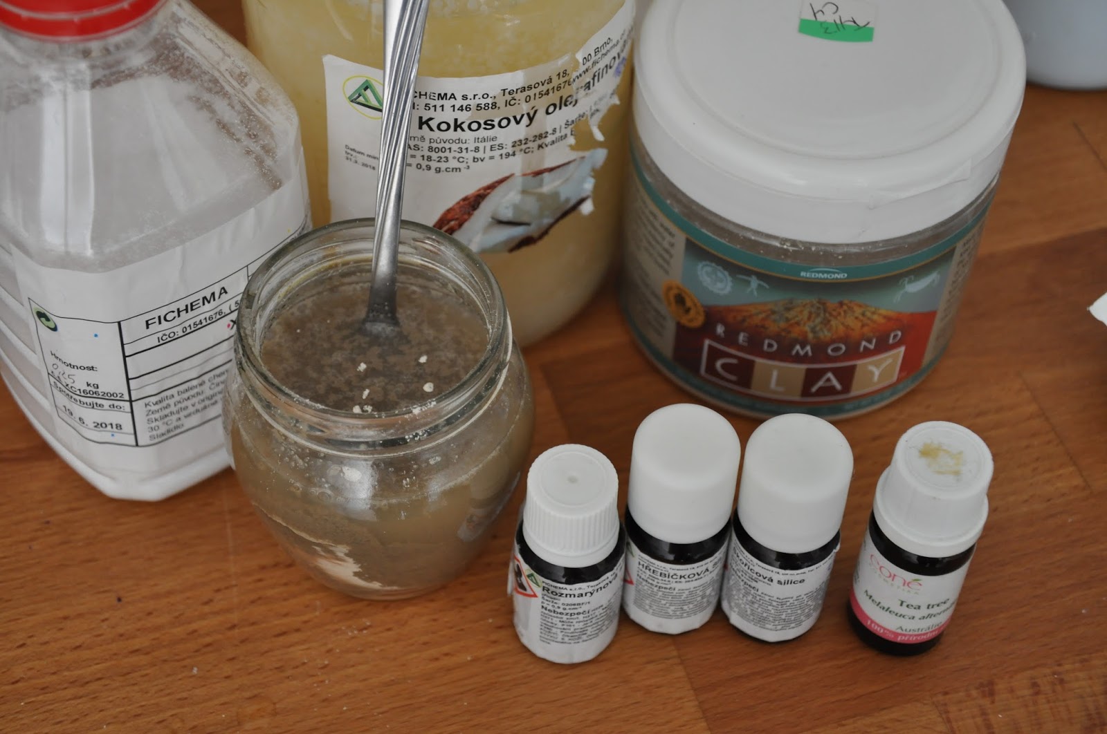 V teplém odvaru jsem rozmíchala xylitol a přidala kokosový olej a všechny silice, poté jsem postupně jsem přimíchávala jíl tak dlouho, až směs nabyla pastovitou konzistenci.