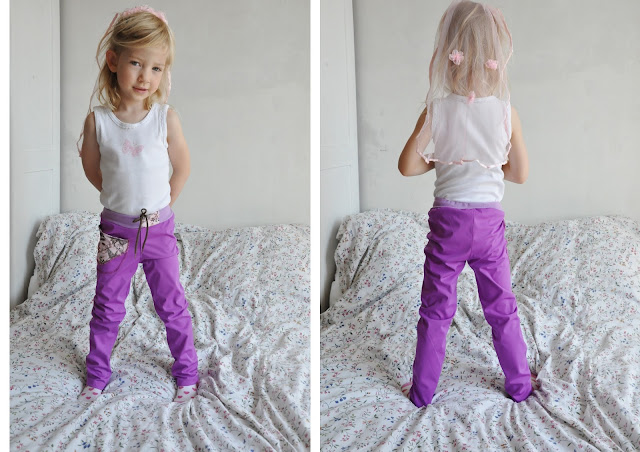 Kalhoty pro roční holčičku jsem ušila s možností stažení dolního lemu do gumy, už mám odzkoušeno, že takto kalhoty vydrží několik sezón. Pro lepší rozeznání předního sedu jsem na tuto stranu našila skleněný knoflík ještě československé výroby!